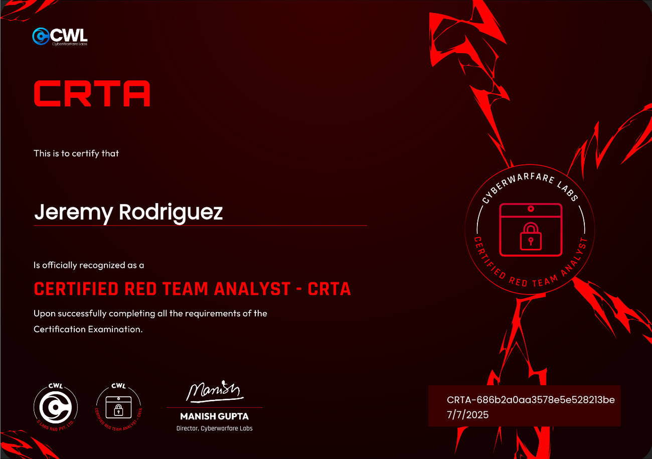 Para mí, el CRTA fue mi primera certificación oficial en ciberseguridad. El curso te guía a través de todos los conceptos fundamentales: desde el acceso inicial y el movimiento lateral, hasta la escalada de privilegios y los ataques al dominio.